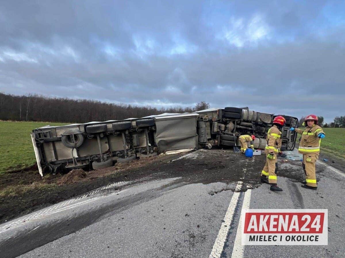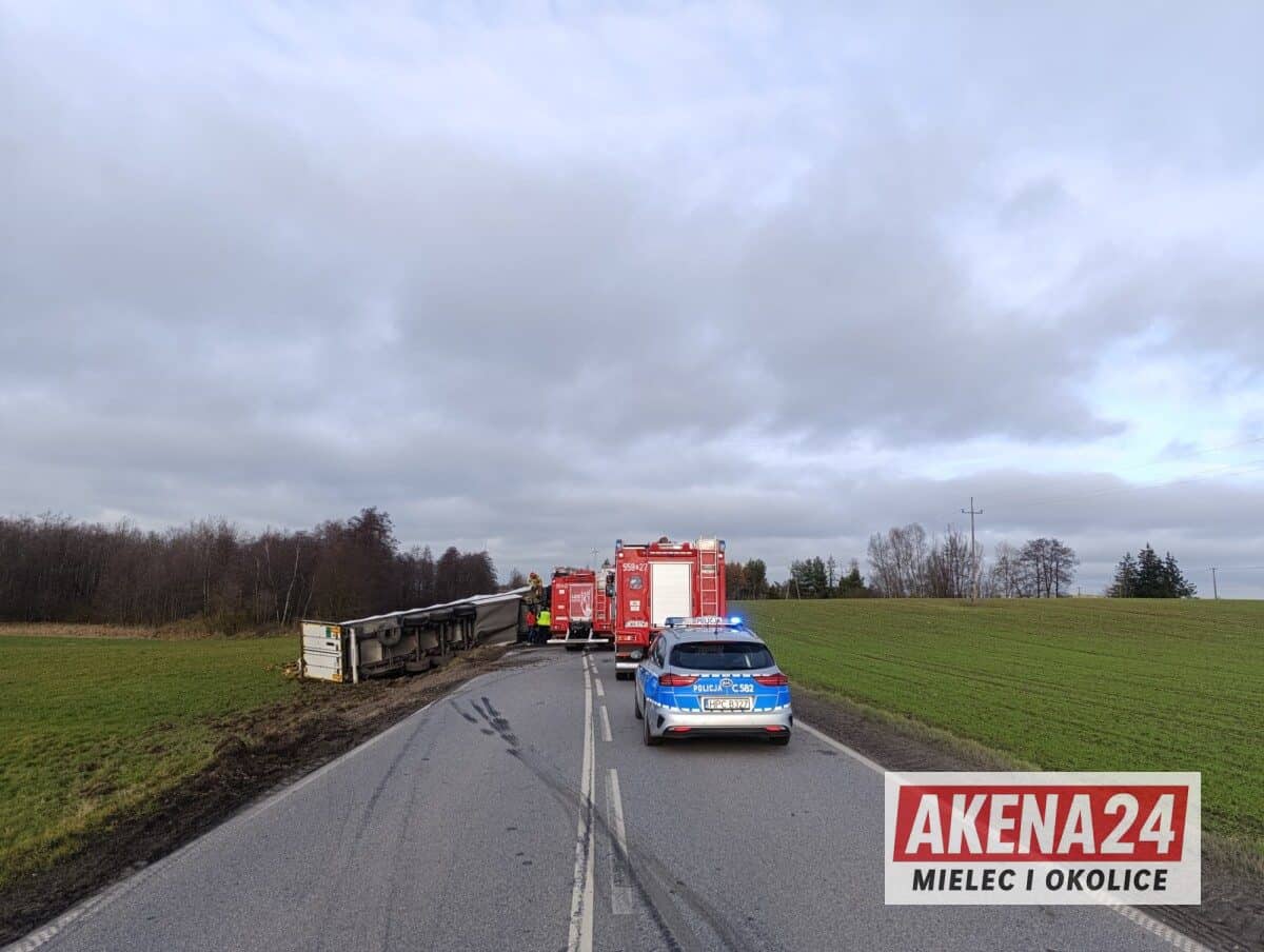 Jak ustalili policjanci pracujący na miejscu, 19-letni kierowca, mieszkaniec Radomyśla Wielkiego w powiecie mieleckim, nie dostosował prędkości do warunków panujących na drodze. W wyniku tego prowadzona przez niego ciężarówka marki Mercedes z naczepą zjechała na pobocze, a następnie przewróciła się, całkowicie blokując drogę wojewódzką nr 534.