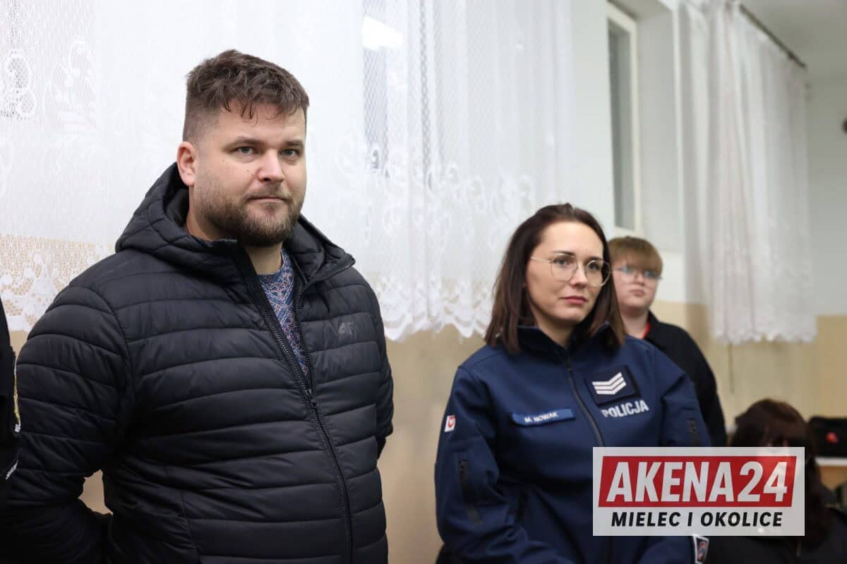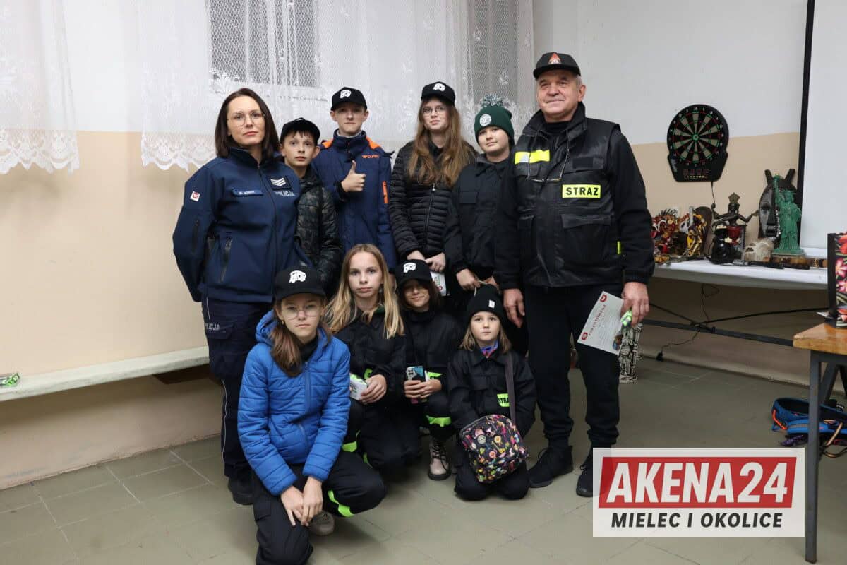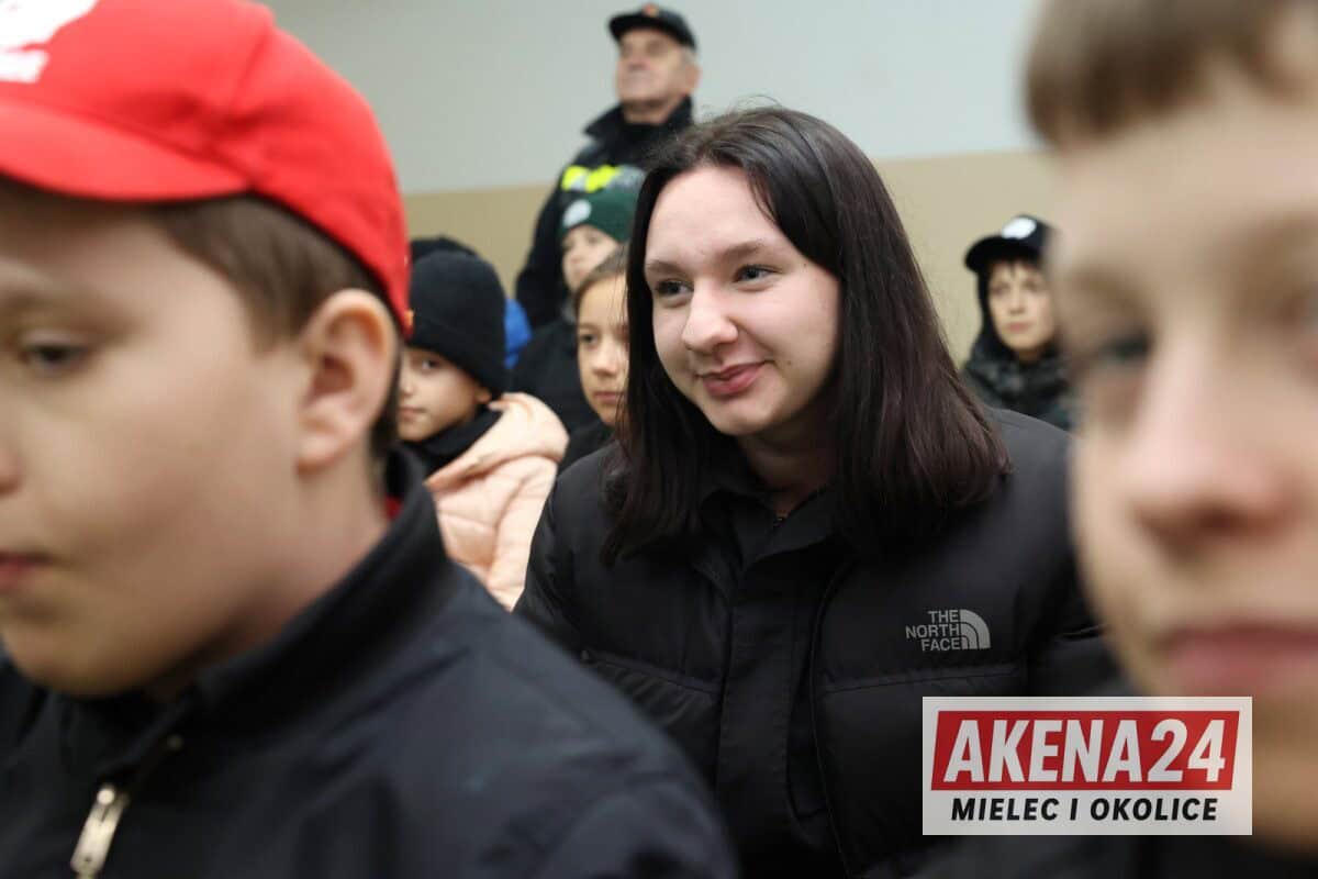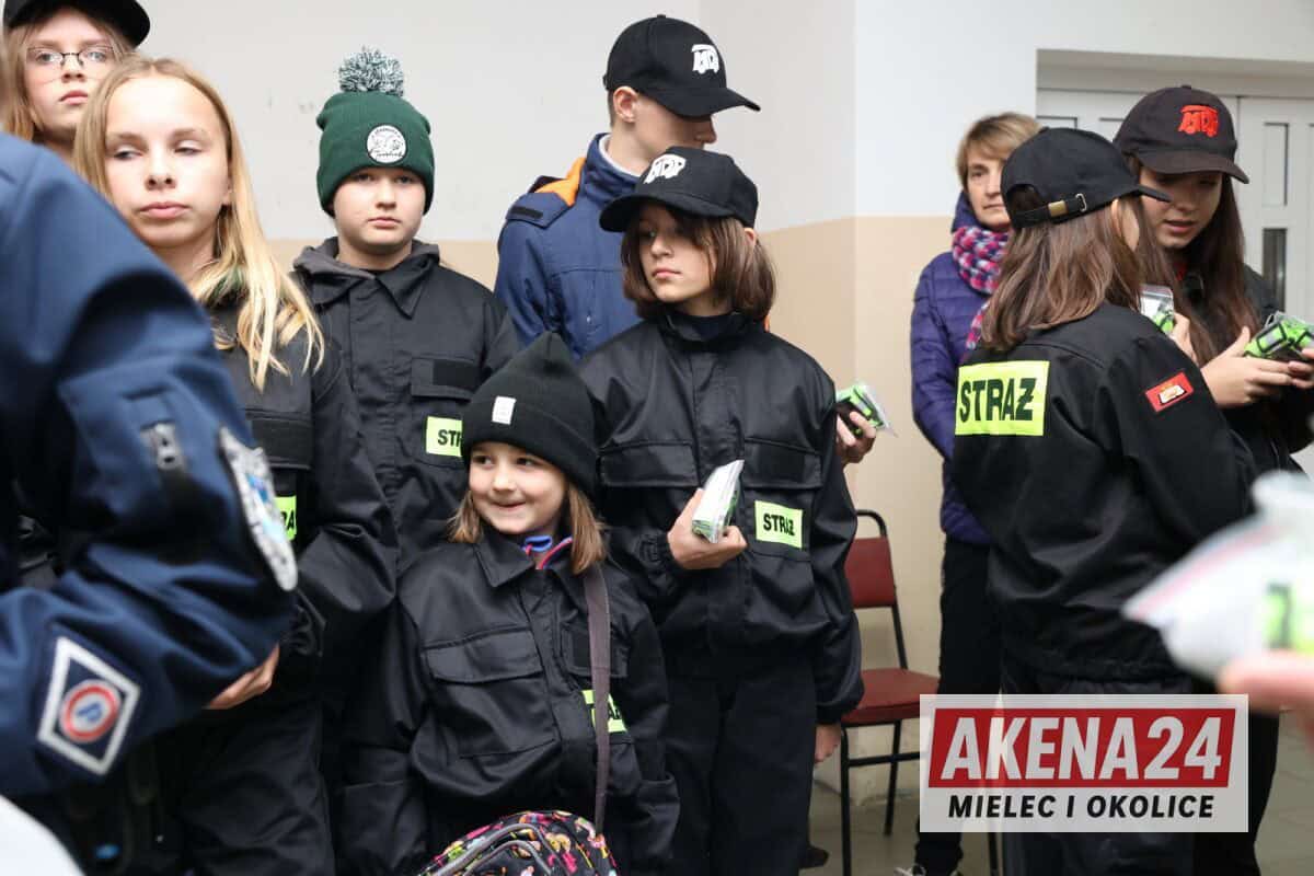 Sierż. szt. Marta Nowak z mieleckiej komendy omówiła zasady bezpiecznego poruszania się po drogach i kluczowe znaczenie elementów odblaskowych dla widoczności pieszego. Dla najmłodszych uczestników przygotowała specjalne miasteczko ruchu drogowego, gdzie dzieci mogły w praktyczny sposób przećwiczyć zasady ruchu drogowego, rozpoznawanie znaków oraz bezpieczne sposoby przechodzenia przez przejście dla pieszych – zarówno z sygnalizacją świetlną, jak i bez niej.